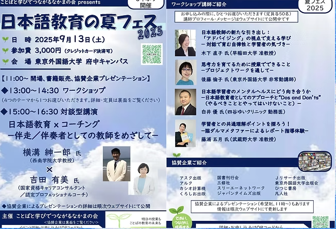 2025年9月13日、東京外国語大学にて「ことばとまなびでつながるなかまの会」(こまつなの会)主催、日本語教育の夏フェス、2025が開催されました。こちらで横溝紳一郎先生との対談型講演に登壇しました。