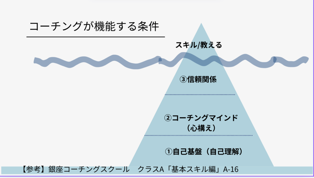 続いて吉田にバトンタッチ。最初にコーチングにおける関係性についてお話しし、コーチングが機能するためには、学習者との信頼関係、「相手の可能性を信じ、味方になる」心構え、そして教師の自己基盤(自己理解)が大切だという話をしました。