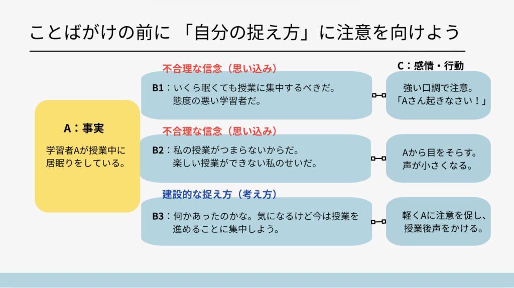 次に、「教師教師の自己基盤(自己理解)」のために、教師自身がある出来事への自分の捉え方を振り返ろうという話をしました。なぜかというと、起きた出来事は全く同じでも、それをどう捉えるかによって、行動・感情が変わるからです。学習者に対して、ことばがけをする上で、教師が自分自身の考え方の傾向やもとごとの捉え方を知っていることが大切です。教師からのことばがけは、なんであれ学習者に直接影響を与えるからです。