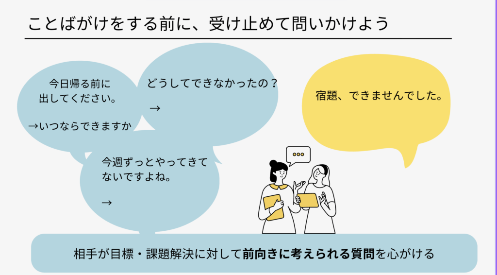 最後に、コーチングの質問(問いかけ)の仕方として、「ことばがけをする前に、受け止めて問いかけよう」という話をしました。コーチングの質問は、相手が思考・感情・経験・アイデアなどと言葉にすることで気づきを得るために行います。そのためには、相手が安心して話せるよう、相手が発した言葉を一旦受け止めて、前向きに考えられる質問を心がけようという話をしました。