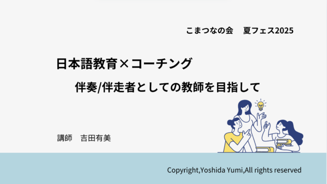 講座、研修の講師 【夏フェス2025】日本語教育×コーチング「伴奏/伴走者としての教師を目指して 2025年10月2日 吉田 有美 https://yoshida-yumi.com/wp-content/uploads/2020/08/logoG2.png 傾聴コーチング&日本語学習支援 吉田有美 2025年9月13日、東京外国語大学にて「ことばとまなびでつながるなかまの会」(こまつなの会)主催、日本語教育の夏フェス、2025が開催さ …